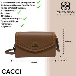 A Bolsa Chenson é o acessório ideal para quem busca praticidade e elegância em um único modelo. Seu design compacto e moderno traz um toque refinado, perfeito para o dia a dia ou ocasiões especiais. Produzida em material sintético de alta qualidade, oferece excelente durabilidade e acabamento superior, com detalhe croco na aba e metais dourados que valorizam ainda mais o visual.