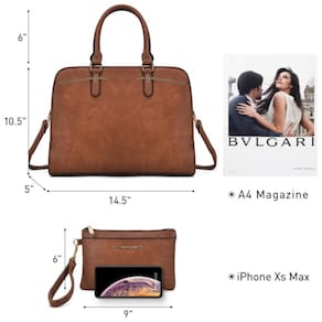 Material de alta qualidade Esta bolsa feminina é feita de COURO VEGAN PU de alta qualidade. Eco friendly e nenhum animal foi prejudicado. Altamente anti riscos e resistente a rasgos, não é fácil ficar fora de forma. Design elegante Detalhado com hardware goldtone de alta qualidade, zíperes, tachas inferiores. As alças superiores em couro laminado são muito confortáveis para transportar e são especialmente reforçadas por uma decoração de metal durável. Bolsos funcionais Um compartimento central com fecho de correr e dois bolsos laterais com fecho de pressão magnética. Um bolsos externos com zíper. Alta capacidade com muitos bolsos pode deixar suas coisas bem organizadas. Dimensão Aprox. Tamanho 35 x 26 x . Pode caber ipad, tablet pequeno, arquivos A4 etc. , Tamanho da embreagem 22 x 15 x . Pode caber facilmente no iphone XS Max. , Comprimento da queda do manuseio , vem com uma alça de ombro ajustável e removível Marca: Não Informado