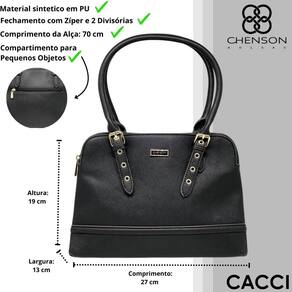 Detalhes na frente Alça em PU, compartimento para pequenos objetos trazeiro e forro em tecido personalizado com logo chenson acabamento em costura contrastante.