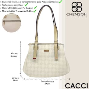 O forro em tecido personalizado, estampado com o logo Chenson, adiciona um toque exclusivo ao acabamento interno. O fechamento principal em ecler personalizado proporciona segurança extra, mantendo seus itens protegidos com estilo.