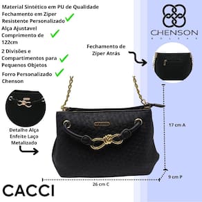 A Bolsa Feminina Chenson Elegante Fecho Ecler Detalhe Corrente é uma escolha perfeita para quem busca um acessório moderno, refinado e funcional para o dia a dia. Seu design estruturado, com textura de destaque e acabamento de alta qualidade, traz um visual sofisticado que combina com produções casuais ou mais alinhadas. O detalhe frontal com laço metalizado reforça o charme do modelo e cria um ponto de elegância que valoriza qualquer look.