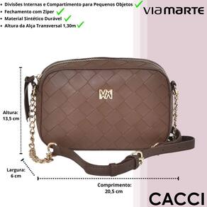 A Bolsa Camera Bag Via Marte é a escolha ideal para quem deseja unir funcionalidade e um toque de sofisticação ao visual. Confeccionada em material sintético de qualidade, ela se destaca pela textura tressê, que adiciona charme e personalidade à peça. O design contemporâneo é evidenciado pela alça ajustável com detalhe em corrente, proporcionando estilo e versatilidade no uso. O espaço interno é forrado e bem planejado, oferecendo praticidade no dia a dia com compartimentos que facilitam a organização dos seus pertences. O toque final fica por conta da placa metálica com o logo da marca, posicionada com elegância na parte frontal, ressaltando o cuidado com os detalhes e a identidade da Via Marte. Uma bolsa perfeita para compor produções urbanas e cheias de atitude.
