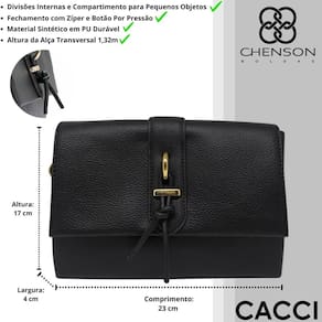 Produzida em PU de alta qualidade, esta bolsa une elegância e funcionalidade com suas duas divisões, perfeitas para organizar pequenos objetos. O interior é forrado com tecido personalizado, trazendo o logo Chenson para um toque exclusivo. O fechamento principal é prático e seguro, combinando um sistema funcional com botão magnético. A alça removível em PU apresenta um acabamento impecável, com costura contrastante que valoriza ainda mais o design. Para completar, os detalhes em ferragens douradas conferem um ar sofisticado, tornando esta peça ideal para quem busca estilo e versatilidade no dia a dia.