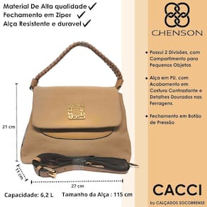 Confeccionada em PU, material de excelente qualidade, essa linda bolsa possui 2 divisões para pequenos objetos. O forro é em tecido personalizado com o logo Chenson. O fechamento principal é com ecler personalizado e botão magnético. A alça trançada em PU com design de mão oferece conforto e estilo. Com acabamento em costura contrastante e detalhes dourados nas ferragens, ela adiciona um toque sofisticado e elegante à peça.