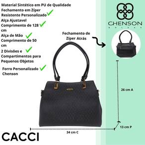 Com alça ajustável de cento e vinte e oito centímetros e alça de mão de cinquenta centímetros, o uso é versátil e confortável, adaptando-se a diferentes estilos e ocasiões. O forro personalizado Chenson complementa o design interno com charme e qualidade, evidenciando o cuidado nos detalhes. Uma bolsa que traduz sofisticação e praticidade, pensada especialmente para quem busca elegância em todos os momentos.