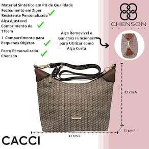 Produzida com material de alta qualidade, conta com fechamento em eclere resistente personalizado, garantindo segurança e facilidade no uso diário. A alça ajustável de até cento e dez centímetros permite diferentes formas de uso, enquanto os ganchos funcionais possibilitam transformar a bolsa em modelo de alça curta, oferecendo ainda mais versatilidade. O forro personalizado Chenson reforça o cuidado com os detalhes e o padrão de excelência da marca.