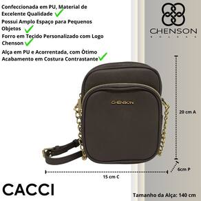 O interior conta com forro personalizado com o logo da Chenson, trazendo um charme extra e ajudando na proteção dos objetos. O espaço interno é perfeito para acomodar itens como celular, carteira, chaves e pequenos acessórios. A bolsinha frontal adiciona ainda mais praticidade, permitindo acesso rápido ao que você mais usa.