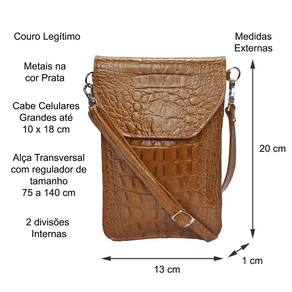 Linda bolsinha transversal, porta celular em couro, possui 2 divisões internas para levar pequenos objetos, documentos, dinheiro, cartões e seu celular. Seu fechamento na parte superior é através de botão ímã, forro de poliéster em tons neutros, metais no banho prateado. Pequena, leve, bem funcional e prática. Espaço suficiente para celulares de vários tamanhos (vide abaixo as medidas).