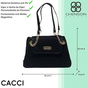 A organização é facilitada pelas duas divisões internas, que mantêm seus pertences acessíveis e bem distribuídos. A alça acorrentada em ferragem dourada, combinada com PU, dá um toque moderno e delicado ao visual, complementado pelos detalhes na frente. O forro em tecido personalizado com o logo Chenson e o compartimento para pequenos objetos agregam funcionalidade e estilo. Uma bolsa que valoriza o look e atende a todas as necessidades!
