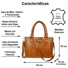 Bolsa feminina tamanho médio, estruturada, para usar na Mão, no Ombro ou Transversal em Couro. A queridinha das brasileiras, essa bolsa é moderna e elegante. Contém 3 divisões internas, alça curta e comprida (com comprimento regulável), muito prática e fácil de usar, ideal para o dia a dia ou em produções casuais que necessitem de estilo sem abrir mão da elegância. Na parte traseira possui 1 bolso fechado por zíper, proporcionando segurança para seus pequenos objetos. Todos os metais são dourados para combinar com a sofisticação e elegância que um produto em couro merece. O acabamento interno do forro é com texturas variadas tipo animal print (padrão oncinha), floral ou similar. Em uma das divisões internas possui um bolsinho fechado por zíper e outros dois abertos para pequenos objetos ou celular. O fechamento da parte superior é feito também com zíper.