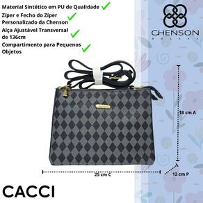 Feita em PU de alta qualidade, esta bolsa combina elegância e praticidade em um design sofisticado. Possui duas divisões e um compartimento ideal para pequenos objetos, garantindo organização no dia a dia. O forro em tecido personalizado com o logo Chenson adiciona um toque exclusivo, enquanto o fechamento ecler principal personalizado oferece segurança. A alça ajustável transversal de 136 cm proporciona conforto no uso, e o acabamento em costura contrastante, aliado às ferragens douradas, eleva a sofisticação do modelo.