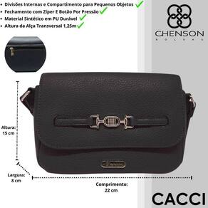 Feita em PU de alta qualidade, essa bolsa combina elegância e funcionalidade em um design sofisticado. Com amplo espaço interno e compartimentos ideais para pequenos objetos, ela garante praticidade sem abrir mão do estilo. O forro em tecido personalizado com o logo Chenson acrescenta um toque exclusivo ao interior da peça. O fechamento principal conta com um sistema duplo, unindo praticidade e segurança através de um detalhe sofisticado. A alça em PU, com acabamento refinado em costura contrastante, realça ainda mais a sofisticação do modelo, enquanto os detalhes em ferragens douradas conferem um toque de requinte, tornando essa bolsa indispensável para qualquer ocasião.