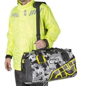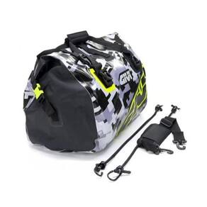 Bolsa impermeável de assento 40 LTS, estampa de camuflagem cinza e amarelo.