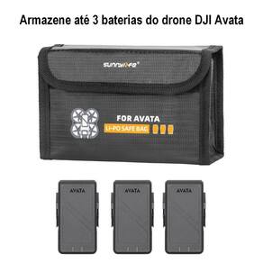 Bolsa Li-Po Safe Antichamas para 3 Baterias de Drone DJI AvataO drone e seus acessórios precisam estar sempre seguros, principalmente os acessórios de maiores riscos, mais frágeis, e que apresentam maior sensibilidade a grandes variações de temperatura, seja em ambientes de alta ou de baixa temperatura. E existe um acessório em particular que merece maior a nossa atenção e cuidado: A BATERIA!