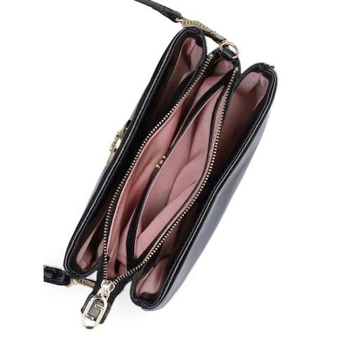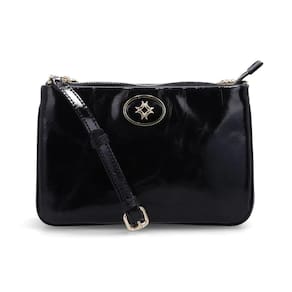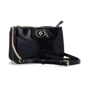 Bolsa tiracolo de tamanho pequeno com acabamento macio e formato estruturado.. Fechamento principal em zíper de metal.. Possui dois bolsos externos embutidos na parte frontal e posterior da bolsa, com fechamento em botão imã.. Alça tiracolo de couro com regulagem de altura e com detalhe de correntes, fixa no produto.. Detalhe para aplicação da placa luas com forração em couro na parte frontal da bolsa.. No interno, bolso sem zíper.. L: 24cm x A: 16cm x P: 8cm..