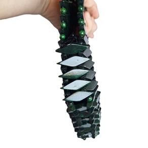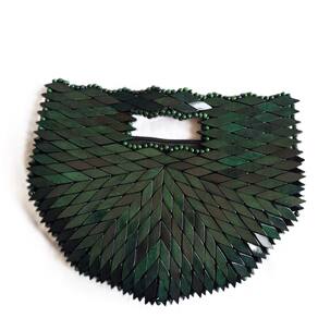 Bolsa confeccionada com pecinhas de madeira no formato de pequenos losângulos, pintados e envernizados, verde, com acabamento interno em cetim e fechamento com zíper. Alça EMBUTIDA.