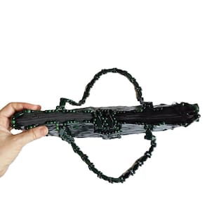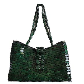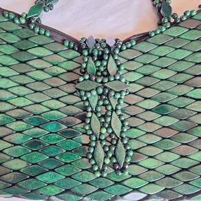 Bolsa confeccionada com pecinhas de madeira no formato de pequenos losângulos, pintados e envernizados, verde, com acabamento interno em cetim e fechamento com zíper. Alça CURTA de MADEIRA formato retangular.