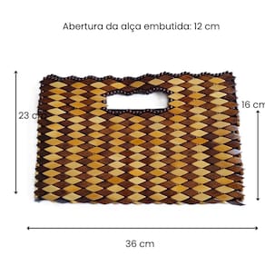 Detalhe do Material: Close-up da textura da madeira e do mosaico. Dimensões Reais: Imagem ao lado de itens comuns para comparação de tamanho. Uso Casual: Foto da bolsa em um ambiente cotidiano, como um café ou parque. Foco nas Bordas: Destaque das contas decorativas na parte superior.