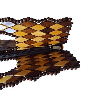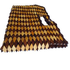 Bolsa confeccionada com pecinhas de madeira no formato de pequenos losângulos, pintados e envernizados, mesclada (marrom e marfim), com acabamento interno em cetim e fechamento com zíper. Alça CURTA de MADEIRA formato retangular.