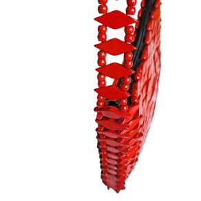 Bolsa confeccionada com pecinhas de madeira no formato de pequenos losângulos, pintados e envernizados, na cor Vermelha, com acabamento interno em cetim e fechamento com zíper. Alça Curta feita do mesmo material medindo 32 cm.
