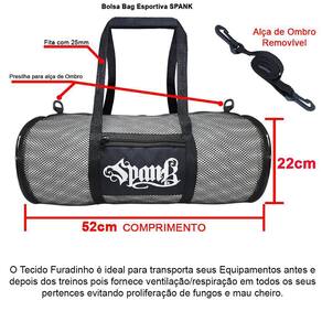 Bolsa mala mochila grande muay thai ou boxe / kickboxing spank. Uma bolsa,mala,mochila 100% respirável com alça para os ombros removível.Ficha tecnica:- confeccionado em tela dupla de nylon que permite 100% de respiração para os equipamentos carregados em seu interior.- fechamento em zíper- bolsos nas laterais- alça removível para os ombros e alças menores para as mãos.- medidas: a22 x l22 x c52cm- tamanho único.Indicação de uso:A bolsa spank combina tecnologia, design moderno e praticidade. Sua tela vazada proporciona maior ventilação para seus equipamentos esportivos antes ou pós treino, evitando mau cheiro por mais tempo. O amplo espaço principal guarda os itens, enquanto o fechamento em zíper fornece segurança. O material durável garante resistência.Uma ótima opção para carregar seus quimonos, luvas, bandagens, caneleiras, equipamentos de skate entre outros.