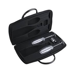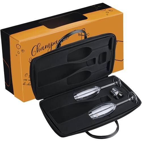 Acompanha: - Caixa modelo exclusivo Boccati - Bolsa em E.V.A. para 1 garrafa de espumante 750ml - 2 taças de cristal titânio para espumante 220ml - 1 tampa para espumante