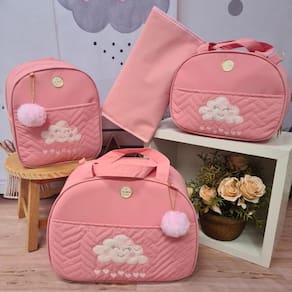 Bolsa maternidade bebê kit 4 peças nuvem rosa impermeável Kit bolsa saída de maternidade nuvem 4 pçsKit maternidade bolsa grande e bolsa média Medidas da bolsa grande: 40 cm de comp 30 cm de alt 17 cm de larg Medidas da bolsa média: 32 cm de comp 22 cm de alt 16 cm de larg Com mochila de costa Trocador 54 cm x 34 cm Chaveiro de bolinha Alça de mão dupla e com alça de ombro removível Composição: Matelassê 68% poliester Eva 30% Kamurcinha pvc 2% Confeccionadas em material de ótima qualidade não descasca forro interno impermeável: kamurcinha pvc Fácil de limparProduto com ótima qualidade fabricado no brasil feitas com dedicação e cuidado para o seu bebê