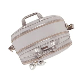 Na cor bege, ela conta com acabamentos na cor dourada cintilante, super delicada, é muito sofisticada, tem tamanho médio, acompanha também um laço, no tom de bege e detalhes bordados no bolso frontal, que dá um charme para a mesma.