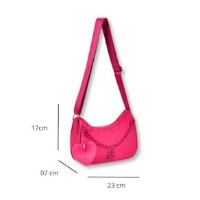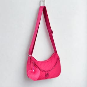 O modelo acompanha um chaveiro de pompom em formato de coração, que dá um toque divertido e apaixonante, além da alça acetinada ajustável, que garante conforto e versatilidade para usar no ombro ou de forma transversal. O zíper tratorado facilita a abertura, enquanto o forro personalizado traz aquele cuidado exclusivo que só a Rebecca Bonbon oferece.