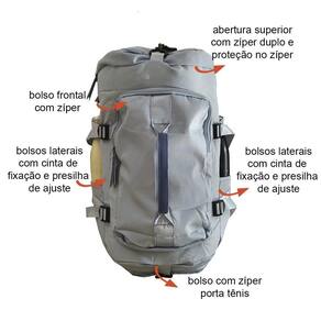 Bolsa Mochila De Viagem VE10410 Cor: azul - Compartimentos inteligentes para separar todas as suas necessidades - Abertura principal com zíper dupo e cobertura nos zíperes - Compartimento exclusivo para armazenar tênis, roupas molhadas ou outras necessidades - Bolso frontal generoso com zíper - Bolsos laterais com cintas de fixação e presilhas de ajuste - Bolso traseiro para armanzenar as alças em caso de utilizar como transversal ou mala de mão - Alças de costas acolchoadas, ajustáveis sendo possível armazenar no bolso traseiro para opção como Mala de Mão ou Tiracolo - Alça de mão fixa e confortável - Alça transversal ajustável e removível Tamanho Aproximado em cm: AxLxP 48x27z18