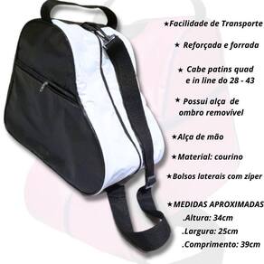 Com medidas aproximadas de altura: 34cm, largura: 25cm e comprimento: 39cm, essa bolsa é compacta e prática, ideal para levar seus patins para onde quiser. Seu material em courino garante durabilidade e resistência, além de ser fácil de limpar.