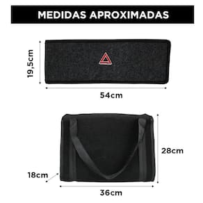 Nesse kit para organizar o porta malas do carro, a bolsa de ferramentas acompanha o porta triângulo de sinalização que possui as medidas necessárias para guardar o item de segurança do veículo.