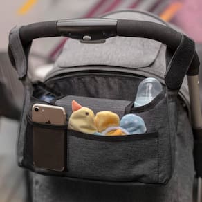 Fácil de acoplar a diferentes carrinhos, tem 6 compartimentos de tamanhos variados para carregar os acessórios do bebê de forma prática e segura.
