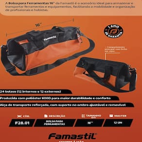 A Bolsa Para Ferramentas 16" Com 24 Bolsos Famastil é um acessório para armazenar e transportar ferramentas e equipamentos, sendo uma boa opção de mobilidade para profissionais e hobistas.
