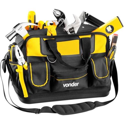 Bolsa Para Ferramentas De Lona 33 Bolsos - Vonder 1 Bolsa em lona para ferramentas. Indicada para acondicionamento de ferramentas e acessórios em geral. Confeccionada em lona reforçada com alças em nylon com abertura total, 33 divisões/bolsos sendo 26 na parte interna e 7 na externa. Comprimento: 41 cm Largura: 21 cm Altura: 28 cm