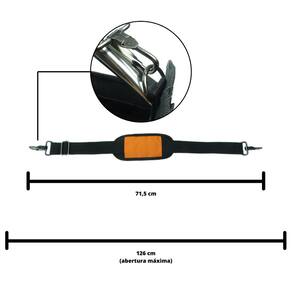 Possui alça fixa em nylon para os ombros e alça tubular para as mãos.