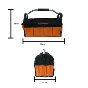 Bolsa de ferramentas com 19 bolsos em lona reforçada. 1 bolso principal, 11 bolsos externos e 7 elásticos internos. Possui alça fixa em nylon para os ombros e alça tubular para as mãos. Indicado para o acondicionamento e transporte de ferramentas e acessórios.