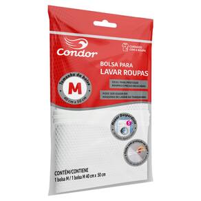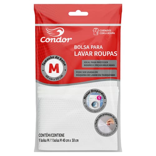 Bolsa para Lavar Roupas. Tamanhos M.Economiza de sabão, amaciante, água, energia e o principal: tempo! Isso mesmo... pois peças íntimas como sutiãs podem ser lavadas juntas com as demais roupas. E aquela camisa/ blusa mais delicada também! Não esquecendo apenas de fazer a devida separação por cores. As Bolsas para Lavar Roupas da Condor ainda possuem um zíper que permite fechá-las e impedir que as roupas saiam da bolsa. Lembrando que as bolsas para Lavar Roupas da Condor são reutilizáveis, podendo ser utilizadas inúmeras vezes.Tamanho M: 40cm x 50cm