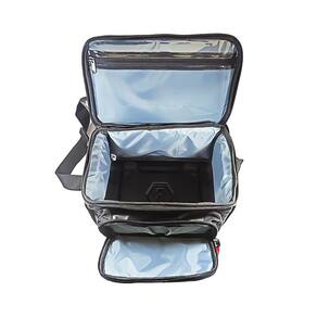 Os bolsos laterais contam com painéis de neoprene, oferecendo maior capacidade. As extremidades possuem bolsos que funcionam como suportes de haste. A alça de ombro é acolchoada e ajustável, podendo ser puxada para se tornar uma alça de transporte superior.