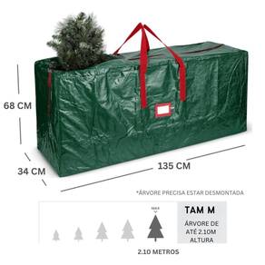 Bolsa sacola para arvore natal com alça e ziper resistente tamanho m solução ideal para guardar a sua árvore de natal após ela ser desmontada. Preserve a sua árvore para o próximo natal armazenando ela dentro de uma bolsa sacola limpa, resistente e segura. Essa bolsa sacola para árvores de natal protegerá as árvores de natal contra danos, poeira, umidade e pragas, deixando assim a sua árvore sempre pronta e limpa quando for preciso usar ela novamente. A bolsa sacola é feita de plástico polietileno super forte e é resiste a água. É anti mofo e serve de proteção para qualquer dano que a água ou umidade possa trazer. Extremamente fácil de transportar. A bolsa sacola possui alças reforçadas muito bem costuradas, garantindo assim estabilidade e segurança para colocar árvores de até 3 metros dentro. Ela possui material reforçado que possibilita o transporte de objetos pesados sem causar no produto. Além disso, possui zíper duplo o qual pode ser aberto para lados opostos. Isso deixa a abertura da sacola muito mais ampla e traz ultra facilidade na hora de colocar e remover a árvore dentro dela. Possui um espaço para você colocar um cartão de identificação na sacola. Dessa forma, ficará fácil de identificar o que tem dentro dela. Quando não for utilizada, favor basta dobrar e guardar ela. Obs: a árvore precisa estar desmontada antes de ser colocada dentro da sacola. Características:
