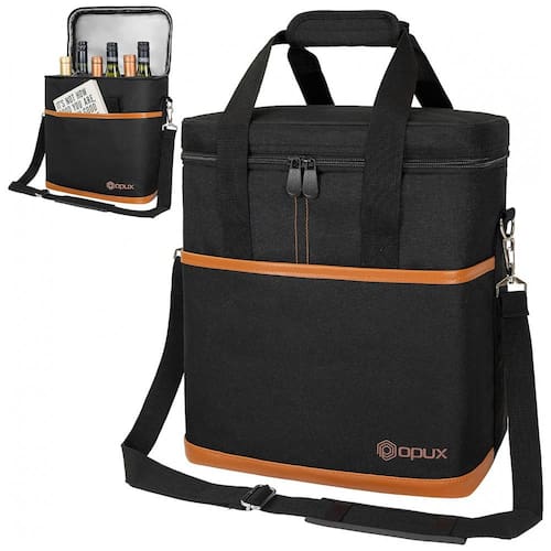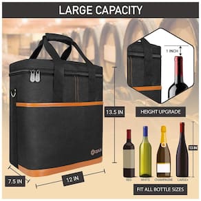 SACO DE VIAGEM PORTÁTIL PARA VINHO Leve suas garrafas de vinho favoritas com você para um restaurante, ao ar livre, parque, praia, jantar ou festa. Também é um ótimo presente para amantes de vinho e anfitriãs presentes. PROTEÇÃO DA GARRAFA DE VINHO E CONTROLE DE TEMPERATURA Forro acolchoado à prova de vazamentos para evitar que as garrafas quebrem durante a viagem, enquanto seu material de isolamento térmico mantém a temperatura do seu vinho estável se estiver refrigerado ou em temperatura ambiente DESIGN CONVENIENTE E INTELIGENTE Apresenta uma alça de ombro ajustável e destacável junto com alças de mão acolchoadas para diferentes estilos de transporte. A aba interior versátil garante que suas garrafas de vinho caibam independentemente do tamanho e oferece proteção acolchoada na divisória. Bonito e durável Feito de poliéster 600D de alta qualidade para garantir máxima durabilidade e acabamento em couro PU para um toque de elegância. Esta bolsa de vinho é clássica e elegante. É um presente de vinho perfeito, presente de aniversário ou presente de dia dos pais