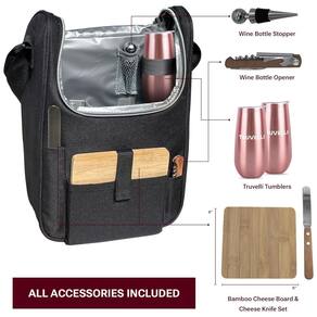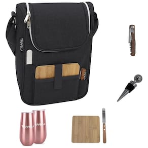 Mantenha seu vinho gelado e protegido enquanto viaja para o parque, piscina, praia ou lago com a Bolsa Térmica Premium Truvelli Black. Leve e totalmente acolchoada, esta bolsa térmica é perfeita para transportar suas garrafas com segurança. Presenteie com classe, esta bolsa francesa para vinho e queijo é durável, à prova d'água, feita em polycanvas resistente a rasgos, manchas e desbotamento. Todos os acessórios mostrados estão incluídos, com espaço especial para armazenamento e viagem fácil. Além disso, com capacidade para duas garrafas ou uma garrafa e queijo, é ideal para encontros no parque, acompanhando queijos, rolls de sushi e vinho. Inspirando casais a planejar fugas românticas, esta bolsa torna mais fácil embalar seus lanches e vinhos favoritos.