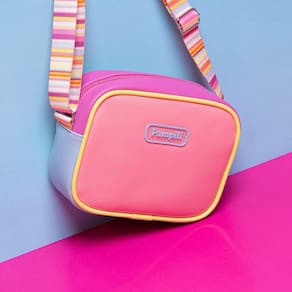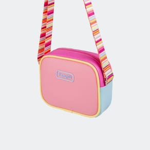 Bolsa tiracolo rosa feita em material sintético com aplicações de cores suaves porém marcantes e alegres. Sua alça é feita em gorgurão listrada toda colorida, perfeita para looks divertidos e estilosos. A bolsa infantil possui tamanho perfeito para usar no dia a dia com muito conforto para as pequenas. Forro em tecido, sem repartições e fecho através de zíper. Alça regulável.