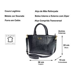 Esse modelo de bolsa nos últimos anos passou a ser a queridinha das brasileiras, além de prática ela é moderna e elegante. Possui alça curta fixa para uso na mão ou ombro e alça comprida transversal removível e com regulador para ajuste de tamanho, ideal para o dia a dia ou em produções casuais que necessitem de estilo sem abrir mão da elegância. Na parte traseira possui 1 bolso fechado por zíper com tamanho médio que cabe celulares, chaves e pequenos objetos. Todos os metais são dourados para combinar com a sofisticação e elegância que um produto em couro merece. O acabamento interno é em forro de cetim, com texturas variadas tipo animal print (padrão oncinha) ou similar. Na parte interna possui um bolsinho fechado por zíper e outros dois abertos para pequenos objetos, moedas ou celular. O fechamento da parte superior é feito com zíper de metal YKK (reconhecido pela qualidade) que proporciona um fácil deslize e resistência.