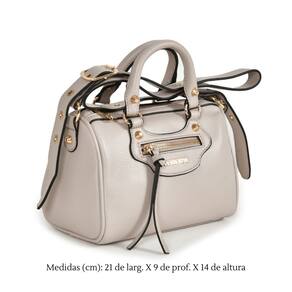 Bolsa tote bag pequena em material sintético com bolso frontal com zíper e logo metálico Via Marte no corpo. Design retangular com alça de mão e alça tiracolo opcional. Fechamento em zíper, ideal para quem busca estilo compacto e praticidade.
