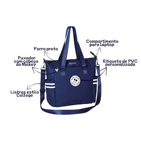 Características Bolsa: - Confeccionada em PVC liso com silhueta prensada - Etiqueta de PVC personalizada - Silk com assinatura do Mickey - Forro preto - Puxador com cabeça do Mickey - Compartimento para laptop - Cabe caderno universitário