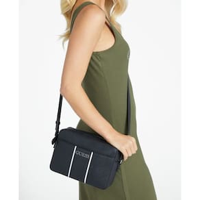 Placa com logotipo de metal dourado na frente e compartimento superior com zíper.