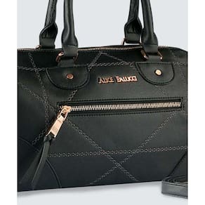 Bolsa feminina, modelo de mão, confeccionada em material sintético. Possui repartição única com fechamento por zíper, alça de mão dupla, alça transversal ajustável e removível, forro em tecido, acabamento e costura no tom.