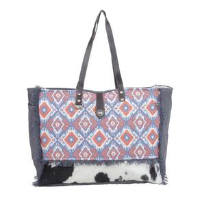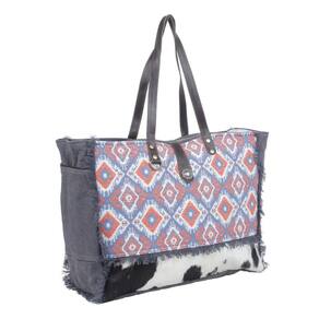 Uma mistura de cores amigáveis e padrões artísticos que criam uma linda malha de força e estilo, esta bolsa de fim de semana fornecerá a você uma companheira de guarda-roupa duradoura e um acessório de moda!