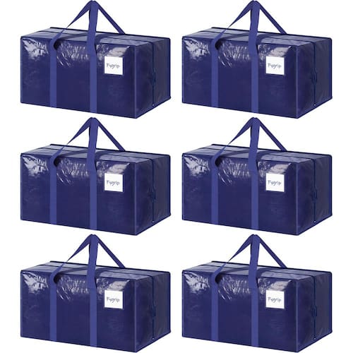 Pacote com 6 sacos de transporte extra pesados grandes com zíper forte e alças confortáveis, sacos de armazenamento de roupas resistentes e duráveis, caixas azuis, caixas de mudança para faculdade, azul escuro - ?Extra resistente?Feito de tecido PE revestido extra espesso de 180 GMS atualizado, bolsas Fygrip com alças totalmente envolventes, zíper forte e costura reforçada prometem segurar com segurança mais de 29,5 kg de carga. - ?Capacidade extragrande? Tamanho de 73 cm C x 35 cm L x 33 cm A, estas bolsas de armazenamento extra grandes oferecem mais de 23 galões de volume, bolsas de embalagem perfeitas para a mudança de estudantes universitários. - ?Fácil de embalar e armazenar?Chega de complicações para montar e desembalar as caixas de mudança. Estas bolsas grandes apresentam um design de zíper aberto, você pode facilmente colocar sua roupa de cama grande dentro das bolsas. Você também pode dobrá-las facilmente após o uso para facilitar o armazenamento. - ?Aderência confortável Fyader?Equipado com alças largas, pode aliviar a carga ao carregar à mão ou no ombro, proporcionando uma experiência de uso mais confortável. Sacos de armazenamento perfeitos, caixas de armazenamento, recipientes para organizadores de armário e armazenamento. - ?Sem perfuração e à prova d'água?Estes sacos de embalagem resistentes são resistentes à perfuração e à prova d'água, eles podem suportar facilmente a jornada difícil de mudança, acampamento, viagem, organização do armário e armazenamento.